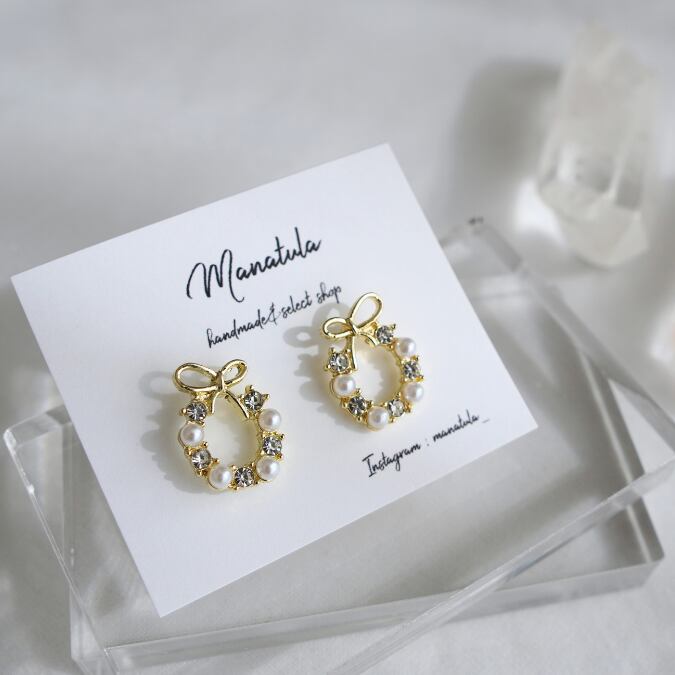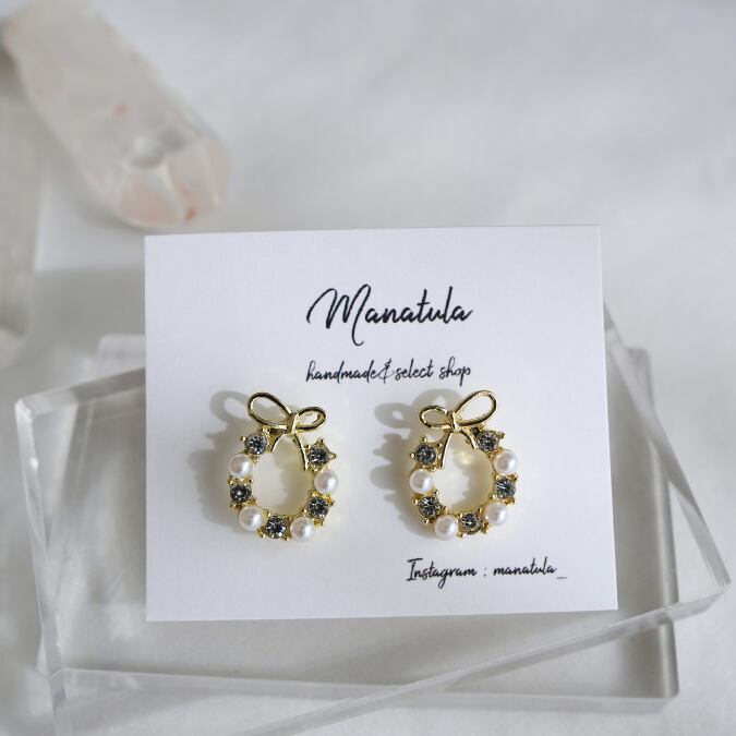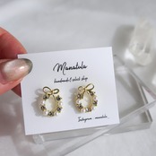 トップにリボン、パールとストーンがぐるりとあしらわれているさりげなく華やかなピアスです